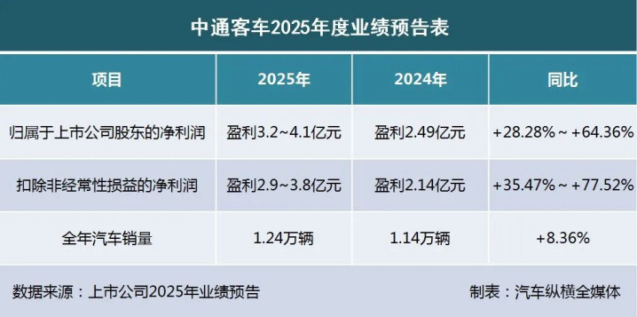 2026年1月28日,中通客车股份有限公司(证券代码000957)发布了2025年度业绩预告。预告显示,中通客车2025年归属于上市公司股东的净利润约为3.2亿-4.1亿元,与上年同期相比,增长28.28%-64.36%。同时,扣除非经常性损益后的净利润约为2.9亿-3.8亿元,与上年同期相比,增长35.47%-77.52%。
