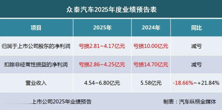 2026年1月28日,众泰汽车股份有限公司(证券代码000980)发布了2025年度业绩预告。预告显示,众泰汽车2025年归属于上市公司股东的净利润约亏损2.81亿-4.17亿元,与年同期相比,将大幅减亏。同时,扣除非经常性损益的净利润预计亏损2.86亿-4.25亿元,与年同期相比,也将实现减亏。