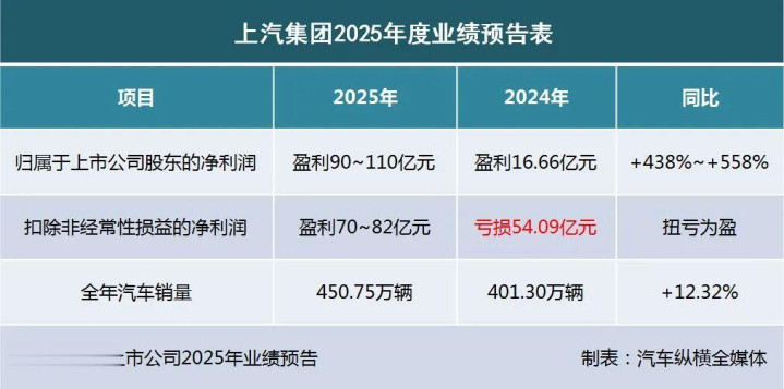 2026年1月16日,上海汽车集团股份有限公司(证券代码600104)发布了2025年度业绩预告。预告显示,上汽集团预计2025年归属于上市公司股东的净利润约为90亿-110亿元,与上年同期相比,大幅增长438%-558%。同时,扣除非经常性损益后的净利润约为70亿-82亿元,实现扭亏为盈。